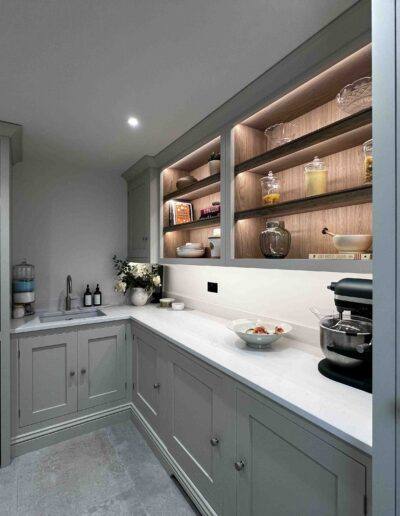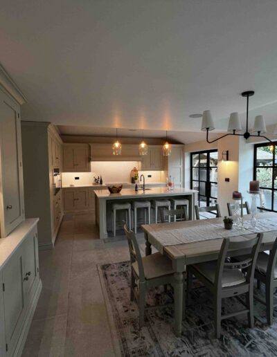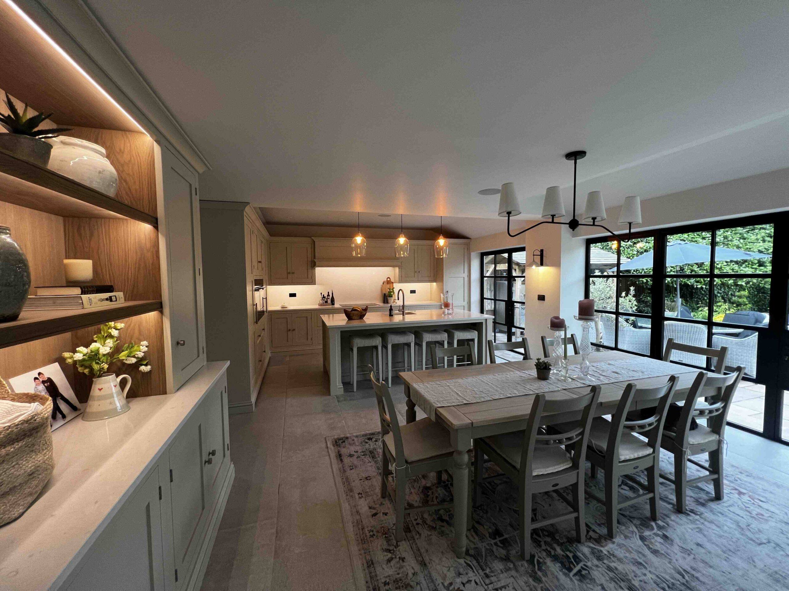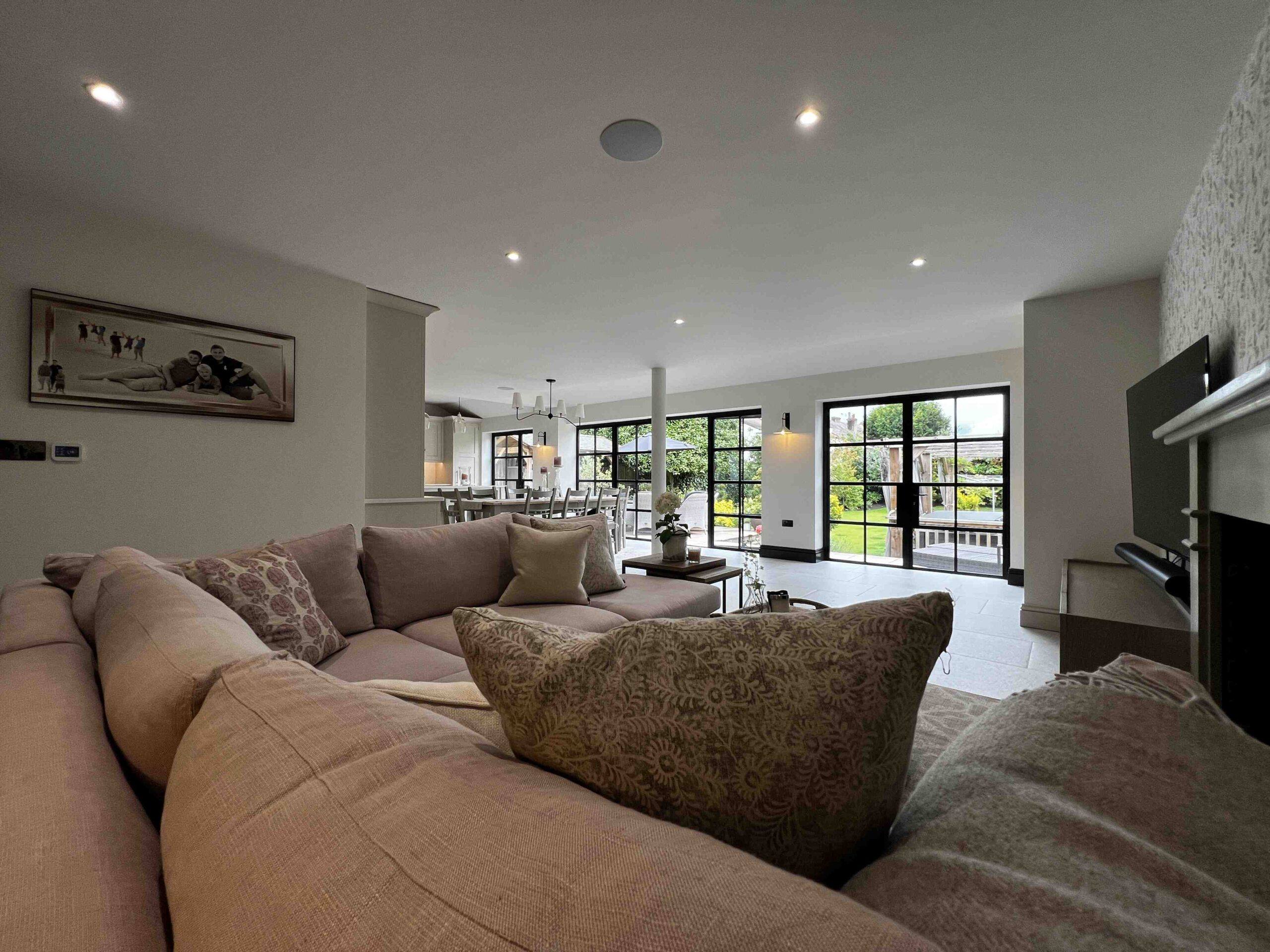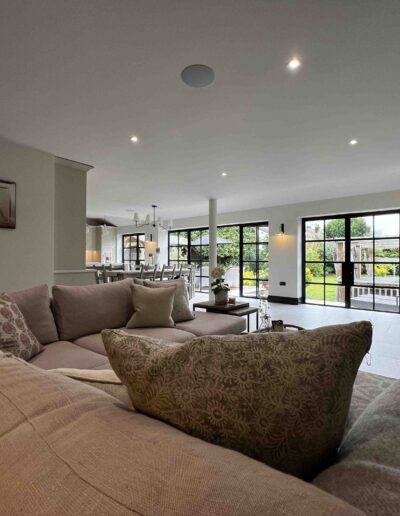 This stunning open-plan living space is a testament to the beauty and functionality of modern architecture. The seamless flow between the kitchen and living area is enhanced by large windows that flood the space with natural light, creating a bright and airy ambiance. The black framed windows with clear glass panes offer breathtaking views of the lush garden, blurring the line between indoors and outdoors. Our team of architects and designers are dedicated to crafting spaces that are both aesthetically pleasing and practical, reflecting your unique style and enhancing your lifestyle.